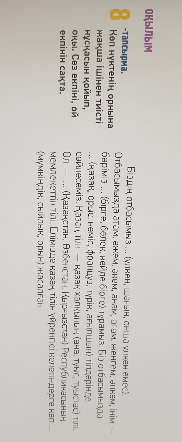Наша семья маленькая. В семье папа, мама, брат- мы все вместе живем. Мы в семье разговариваем на казахском, русском языках. Казахский язык- наш родной язык. Он - государственный язык Республики Казахстан. В нашей стране есть много возможности для изучения казахского языка.