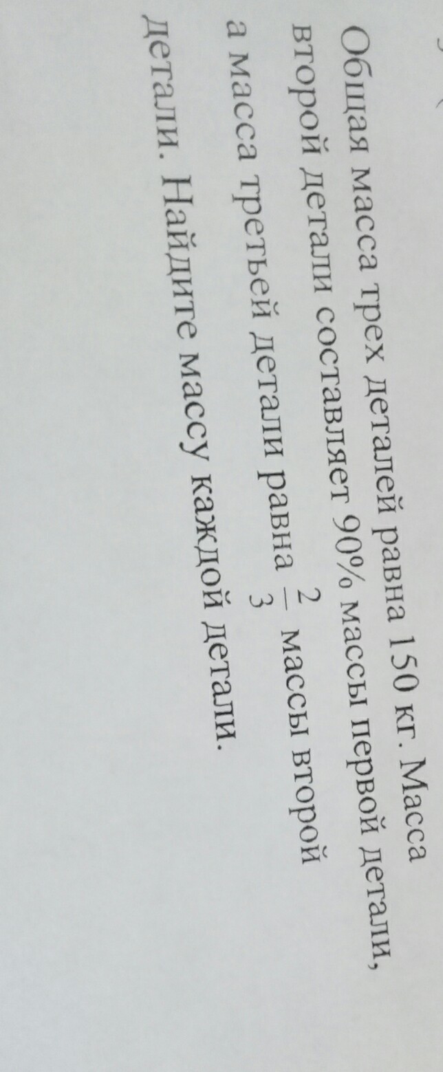Общая масса трёх деталей равна 150кг. Масса второй детали составляет 90%массы второй детали ,а масса третьей детали равна