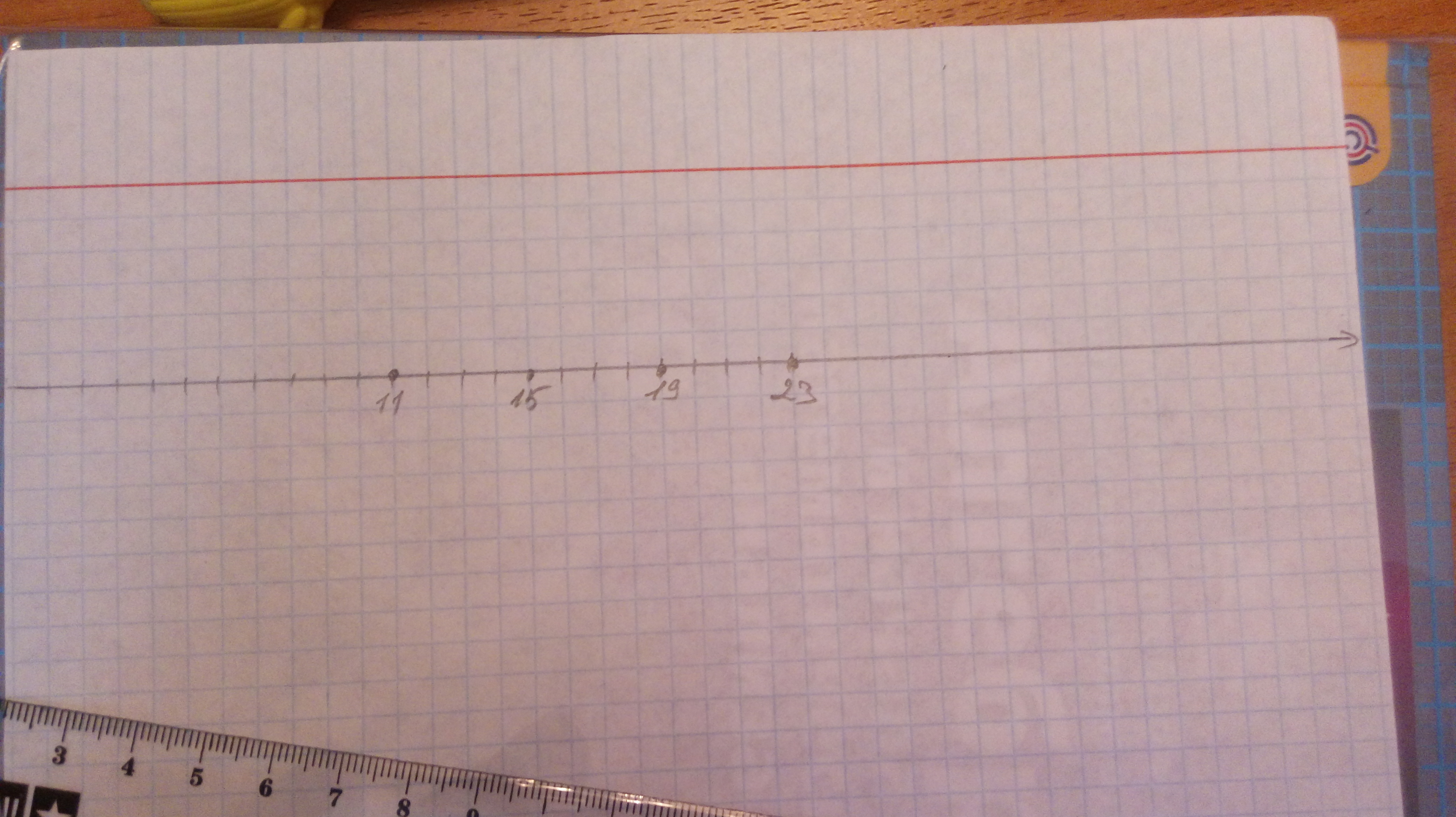 Выберите единичный отрезок и отметьте на координатном луче точки, координаты которых: 11, 15,19 и 23.