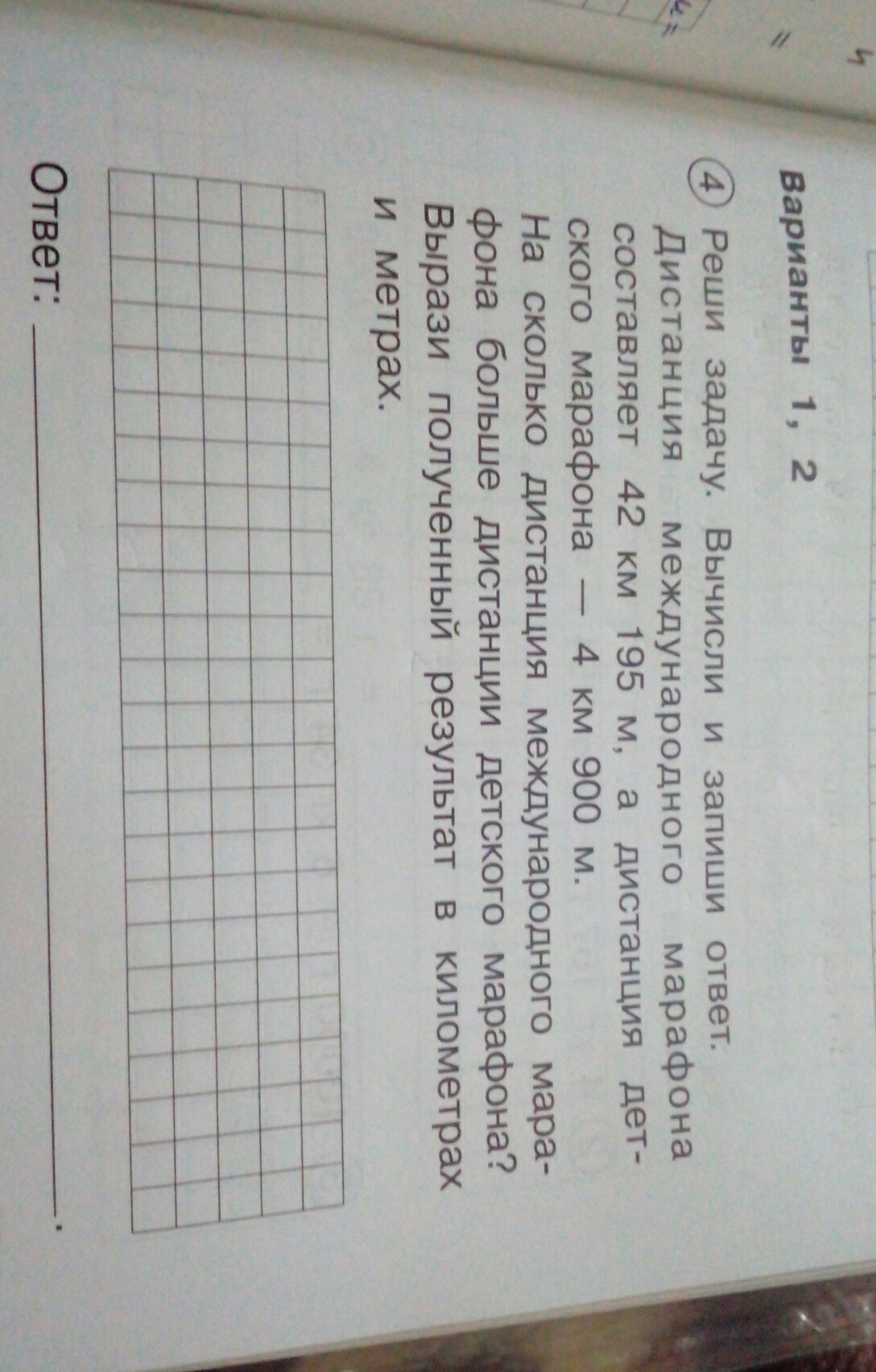Реши задачу Вычисли и запиши ответ дистанции международного марафона составляет 42 км 195 м а дистанция детского марафона 4 км 900 м на сколько дистанции международного марафона большие дистанции детского марафона Вырази полученный результат в километрах и метрах