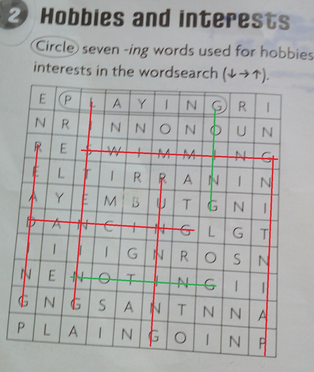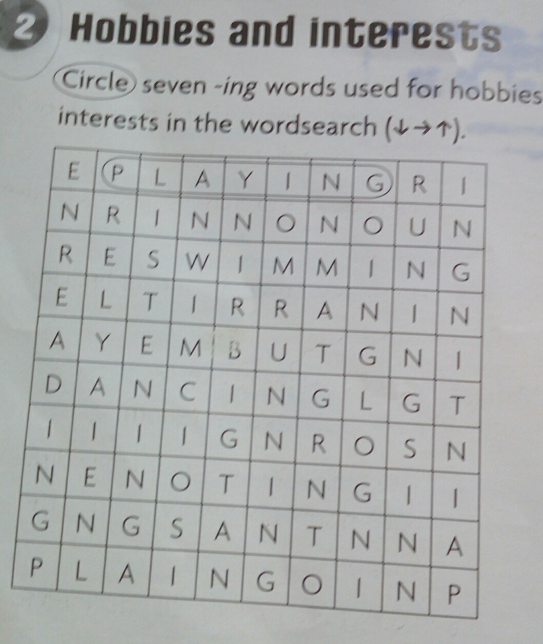 Circle seven -ing words used for hobbies and interests in the wordsearch.
