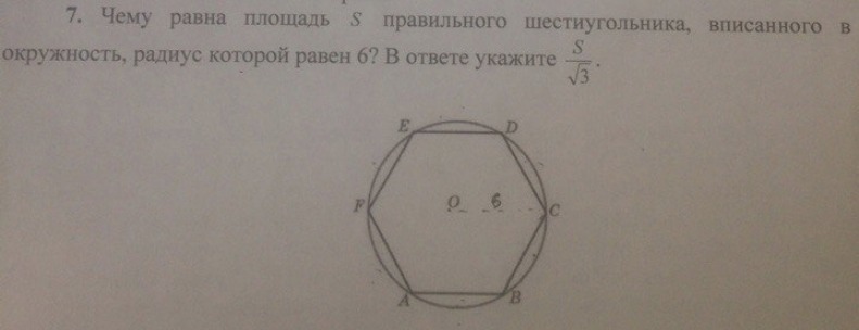 Чему равна площадь правильного шестиугольника, вписанного в окружность, радиус которой равен 6?
