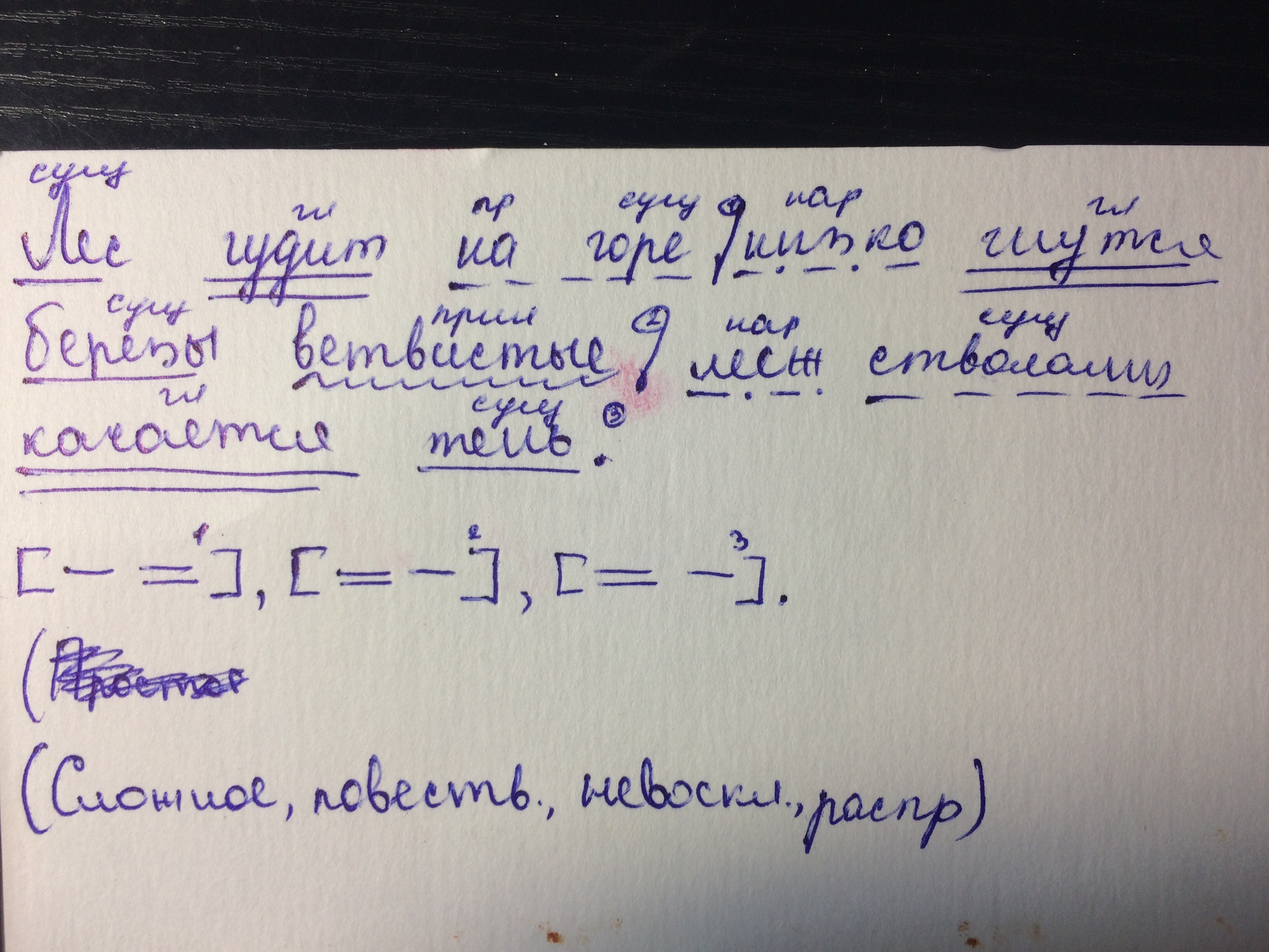 СИНТАКСИЧЕСКИЙ РАЗБОР ПРЕДЛОЖЕНИЯ:ЛЕС ГУДИТ НА ГОРЕ,НИЗКО ГНКТСЯ БЕРЁЗЫ БЕТВИСТЫЕ,МЕЖ СТВОЛАМИ КАЧАЕТСЯ ТЕНЬ.