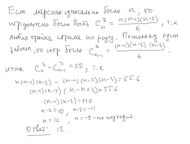 СРОЧНО!!! ДАЮ 50+25 БАЛЛОВ!!! М-шахматы это игра в которую можно играть только втроем. Несколько марсиан решили сыграть несколько партий в м-шахматы так, чтобы каждые трое играли все вместе ровно один раз. Один из марсиан заболел и марсианам пришлось играть на 55 игр меньше. Сколько всего было марсиан (включая заболевшего)?