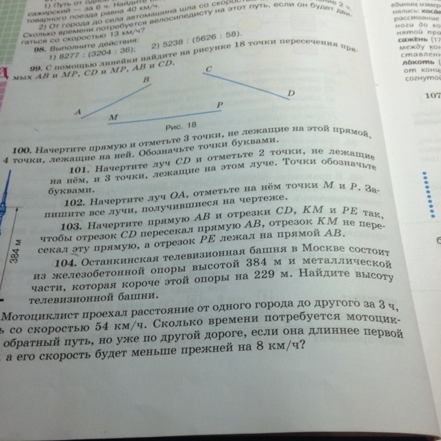 103) рисуешь прямую АВ и отрезок СD наискосок на этой прямой. Отрезок КМ рисуй в стороне от прямой. Дальше поставь на прямой (не на ее концах!) 2 точки и обозначь их как РЕ