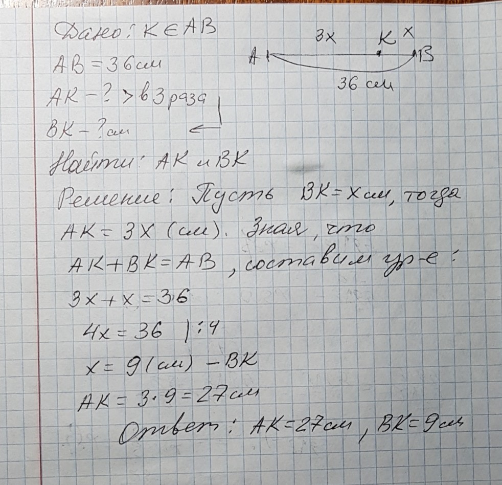На отрезке АВ длиной 36 см выбрана точка К. Найдите длины отрезков АК и ВК если АК больше ВК в 3 раза. С объяснением пожалуйста!