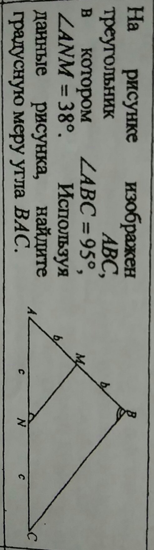 На рисунке изображен треугольник АВС, в котором угол АВС=98, а угол ANM=38. Используя рисунок, найдите градусную меру угла BAC.
