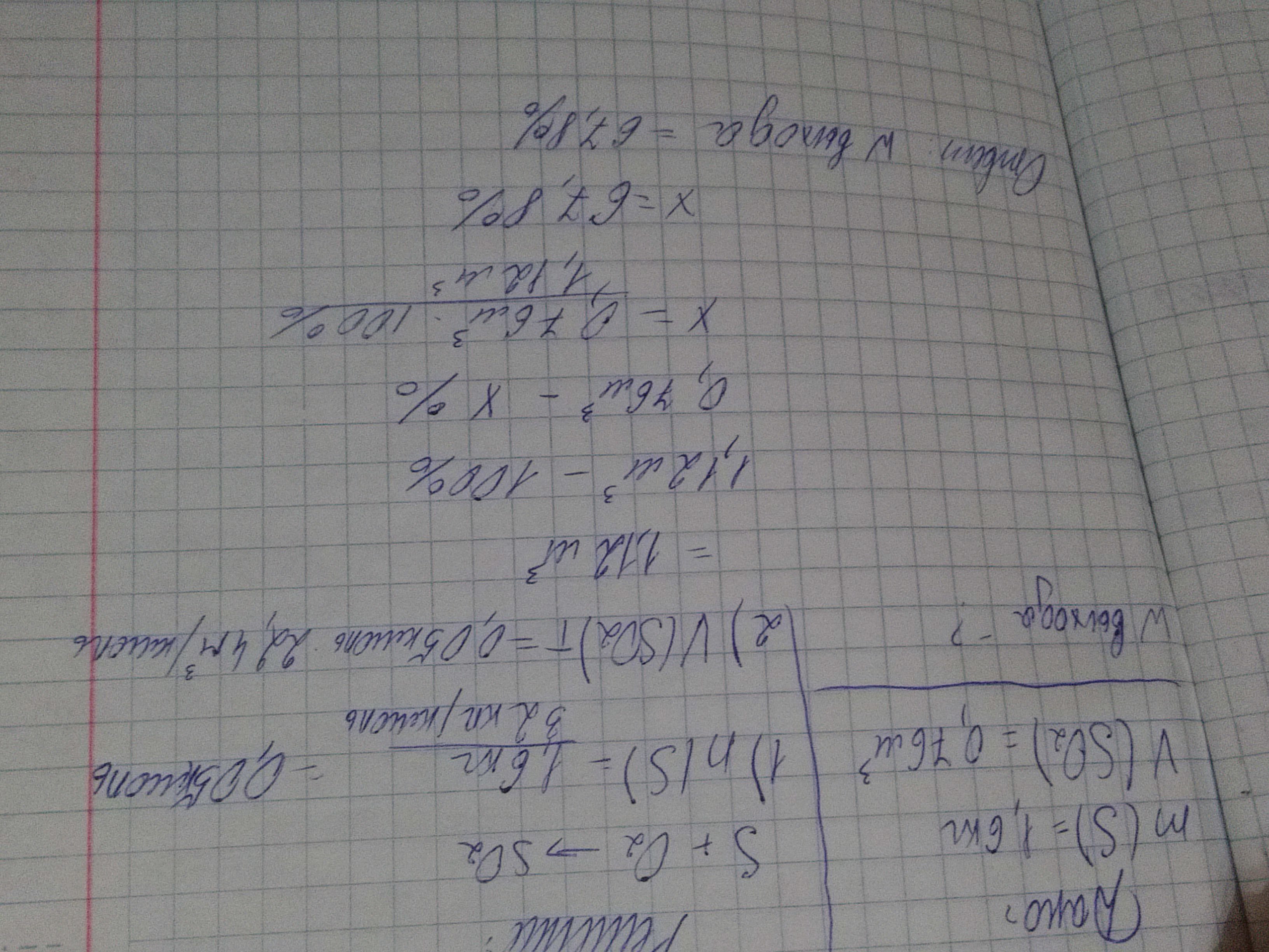 При сжигании 1,6 кг серы, выделился SO2 объемом 0,76 м^3, рассчитать долю выхода продукта реакции