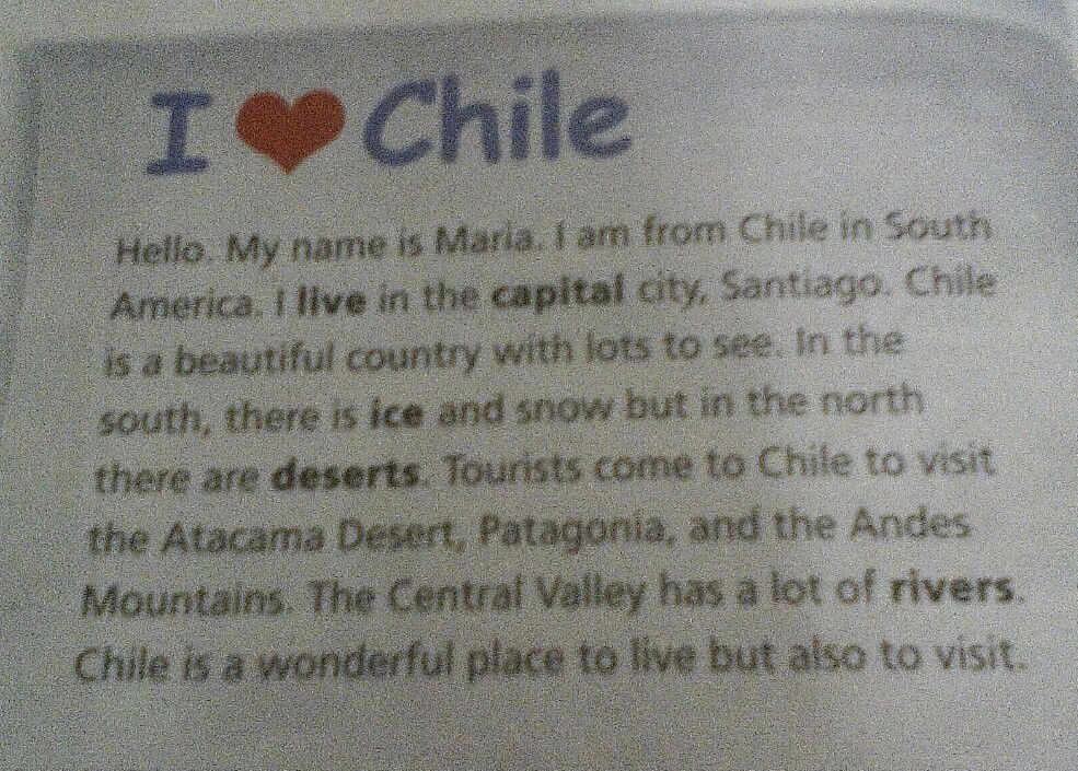 Здравствуйте. Меня зовут Мария из Чили в Южной Америке, живу в столице. Чили - прекрасная страна с множеством достопримечательностей на юге, есть лед и снег, но на севере есть пустыни. Туристы приезжают в Чили, чтобы посетить пустыню Атакама, Патагонию и горы Анды. В Центральной долине есть много рек. Чили - прекрасное место для жизни, но и для посещения.