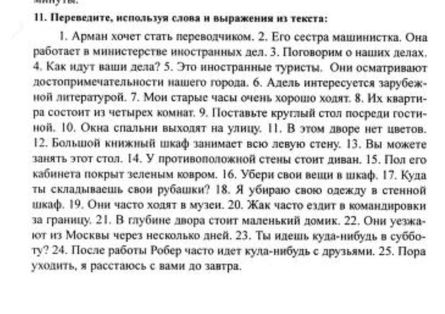 I. Armand veut devenir un interprète. 2. Sa sœur est dactylographe. Elle travaille au ministère des Affaires étrangères. Parlons de nos affaires. 4. Comment allez-vous? 5 touristes étrangers, ils visitent les sites touristiques de notre ville. 6, Adel s'intéresse à la littérature étrangère. 7. Ma vieille montre est très bonne. 8. Leur appartement se compose de quatre pièces. 9. Mettre une table ronde au milieu du salon. 10, les fenêtres de la chambre donnent sur la rue 11. Il n'y a pas de fleurs dans cette suite. 12. Une grande bibliothèque occupe tout le mur gauche. 13. Vous pouvez prendre cette table. 14. Au mur opposé, il y a un canapé. 15. Le plancher du bureau est recouvert d'un tapis vert. 16. Prenez vos affaires dans le placard. 17. Où repliez-vous vos chemises? 18. J'ai mis mes vêtements dans le placard. 19. Ils fréquentent souvent les musées. 20. Jacques participe souvent à des voyages d'affaires à l'étranger 21. Dans la cour, il y a une petite maison. 22. Ils sortent de Moscou dans quelques jours. 23. Allez-vous n'importe où le samedi? Après le travail, Robert va souvent chez lui. 25. Il est temps de partir, je vous quitterai jusqu'à demain.