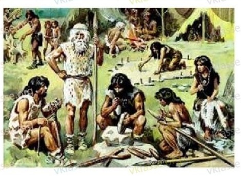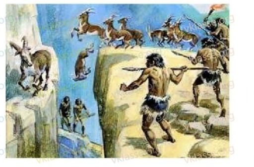 это община людей ,примерно каменного века охотятся на оленя, уже после охоты один мужчина разделывает тушу,женщина заготавливает шкуру,а на переднем плане один пытается развести костер,а другой чинит орудие промысла. третья картина обычный рисунок заделанный под аниме
