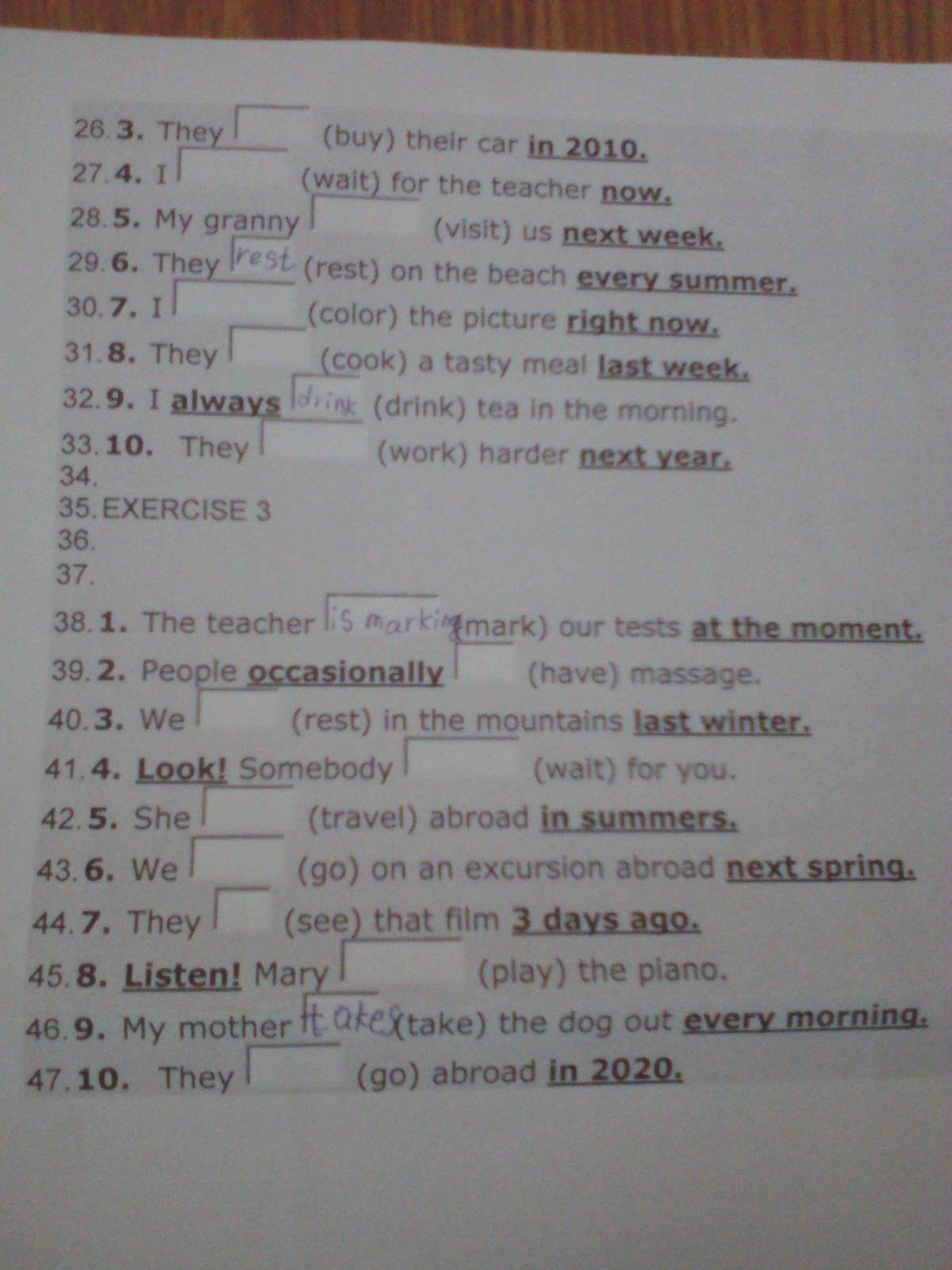26. Bought, 27. Waiting, 41. Waiting , 43. Going, 44. Saw, 45. Playing.