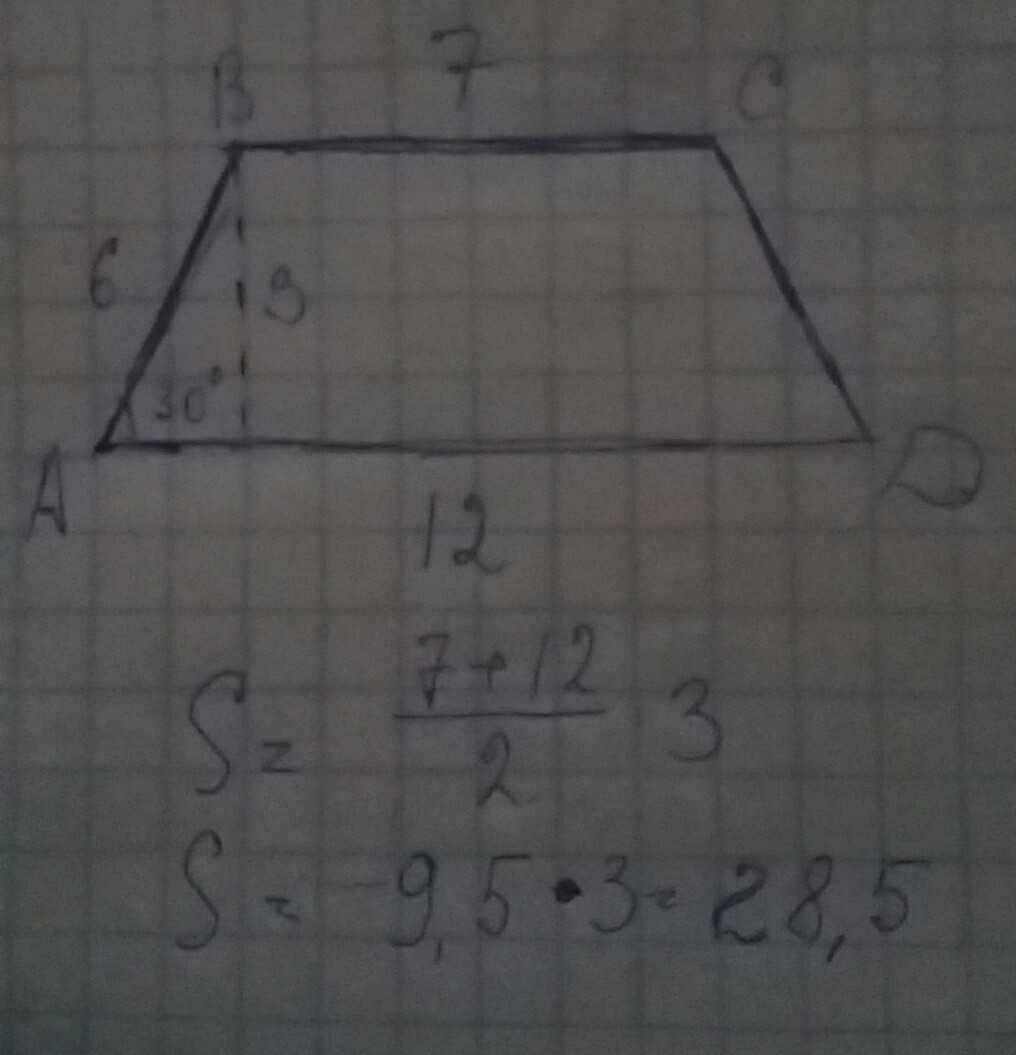 по геометрии длина параллельных сторон трапеции равны 7 см и 12 см Боковая сторона длина которой равна 6 см и образует с основанием угол равный 30 градусов Вычислите площадь трапеции