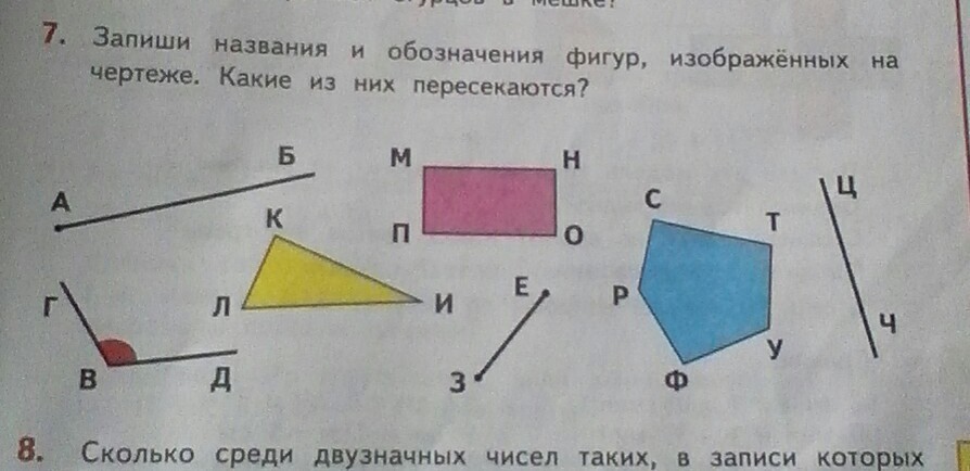луч (а,б) , угол (г,б,д) , треугольник (л,к,и) , отрезок (з,е) , прямоугольник (м ,н ,о,п) , пятиугольник (с,т,у,ф,р), прямая (ц, ч ).