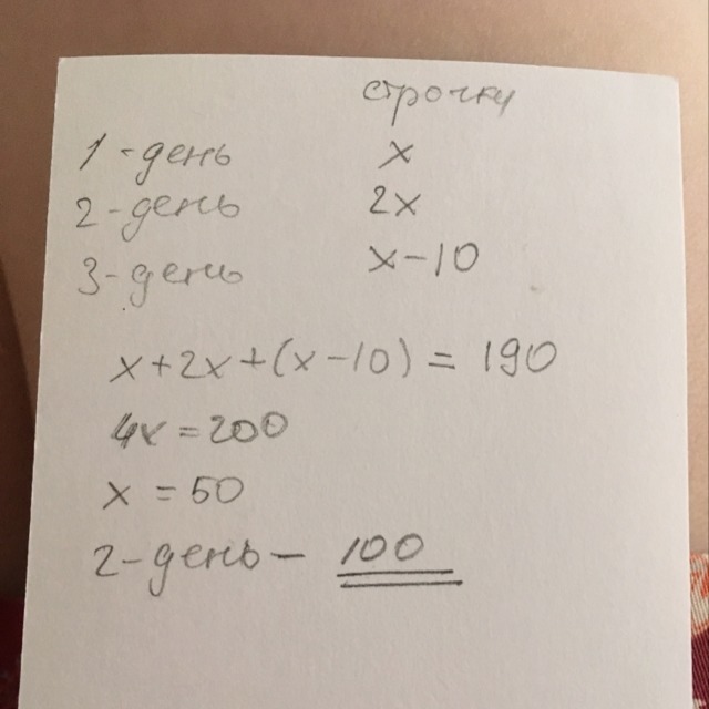 За 3 дня двое программистов написали 190 строк кода, причём за второй день в 2 раза больше, чем за первый. А за третий - на 10 строк меньше, чем за первый. Сколько строк кода они написали во второй день?