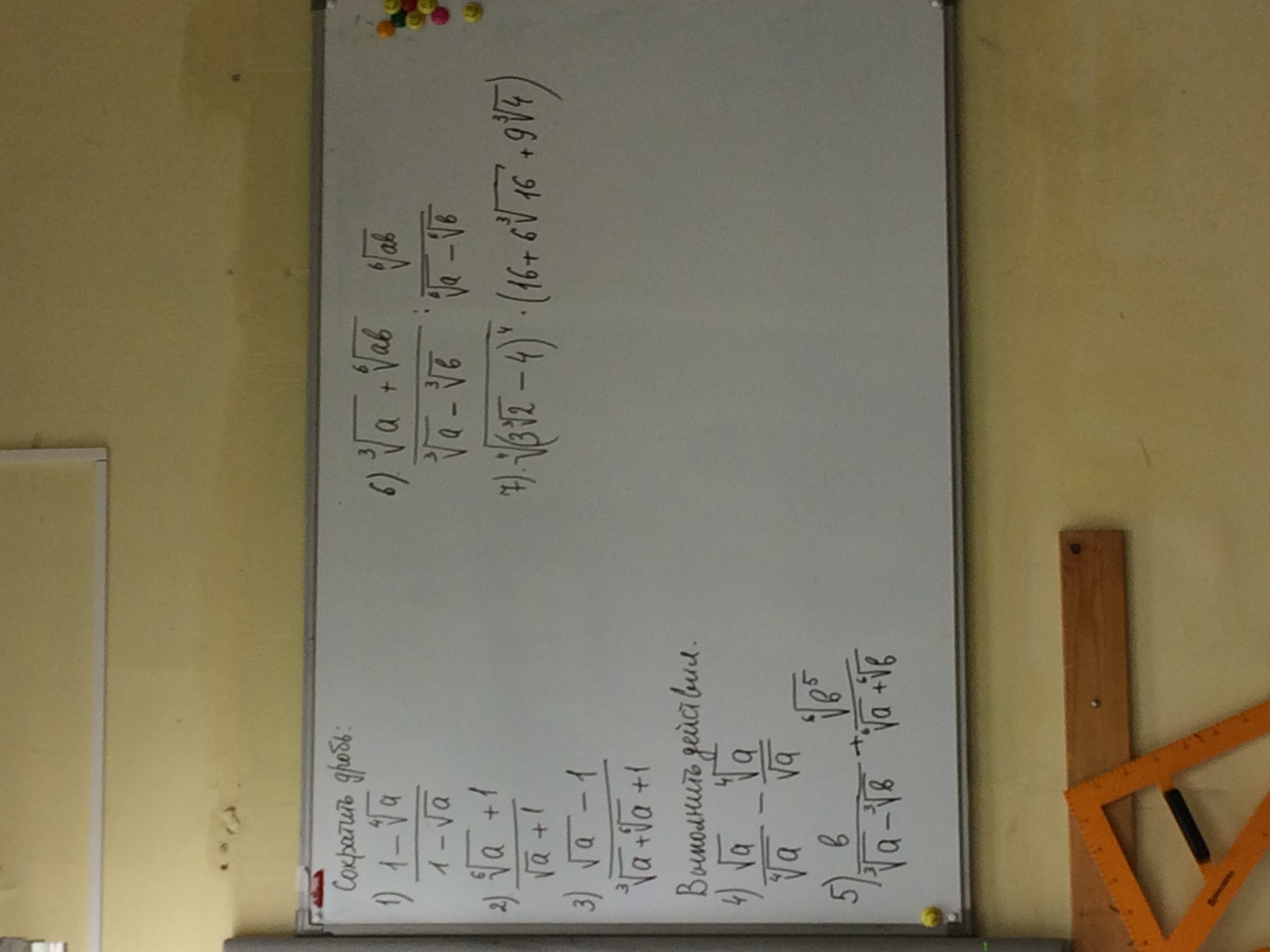 sqrt{ frac{1- sqrt[4]{a} }{1- sqrt{a} } }= frac{(1- sqrt{a})(1+ sqrt{a})  }{1- sqrt{a} }= 1+ sqrt{a} \ \    frac{ sqrt[6]{a}+1 }{ sqrt{a}+1 }= frac{( sqrt{a}+1)(a- sqrt{a}+1)  }{ sqrt{a}+1 }=a- sqrt{a}+1 \  \  frac{ sqrt{a}-1 }{ sqrt[3]{a}+  sqrt[6]{a}+1}= frac{( sqrt[6]{a}-1)( sqrt[3]{a}+ sqrt[6]{a}+1) }{ sqrt[3]{a}+ sqrt[6]{a}+1}= sqrt[6]{a}-1 \  \  \