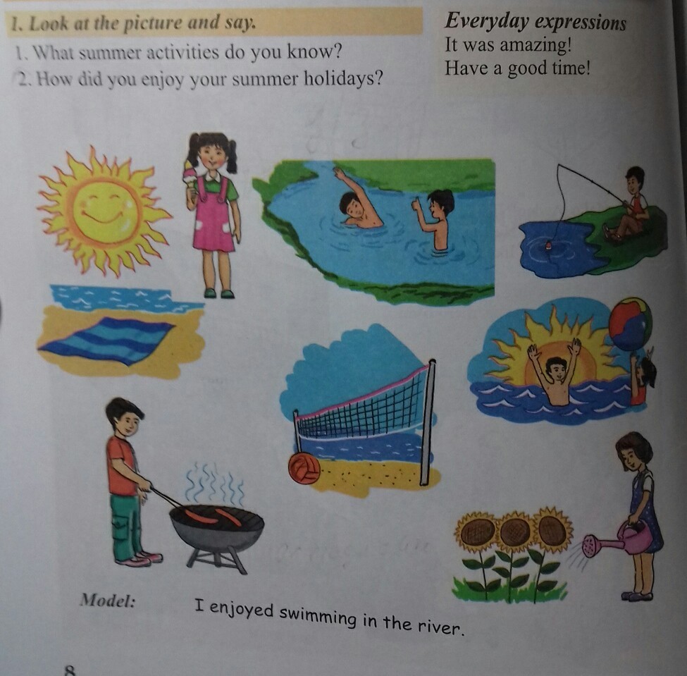 2.I enjoyed playing volleyball, riding bike ahd swimming in the lake