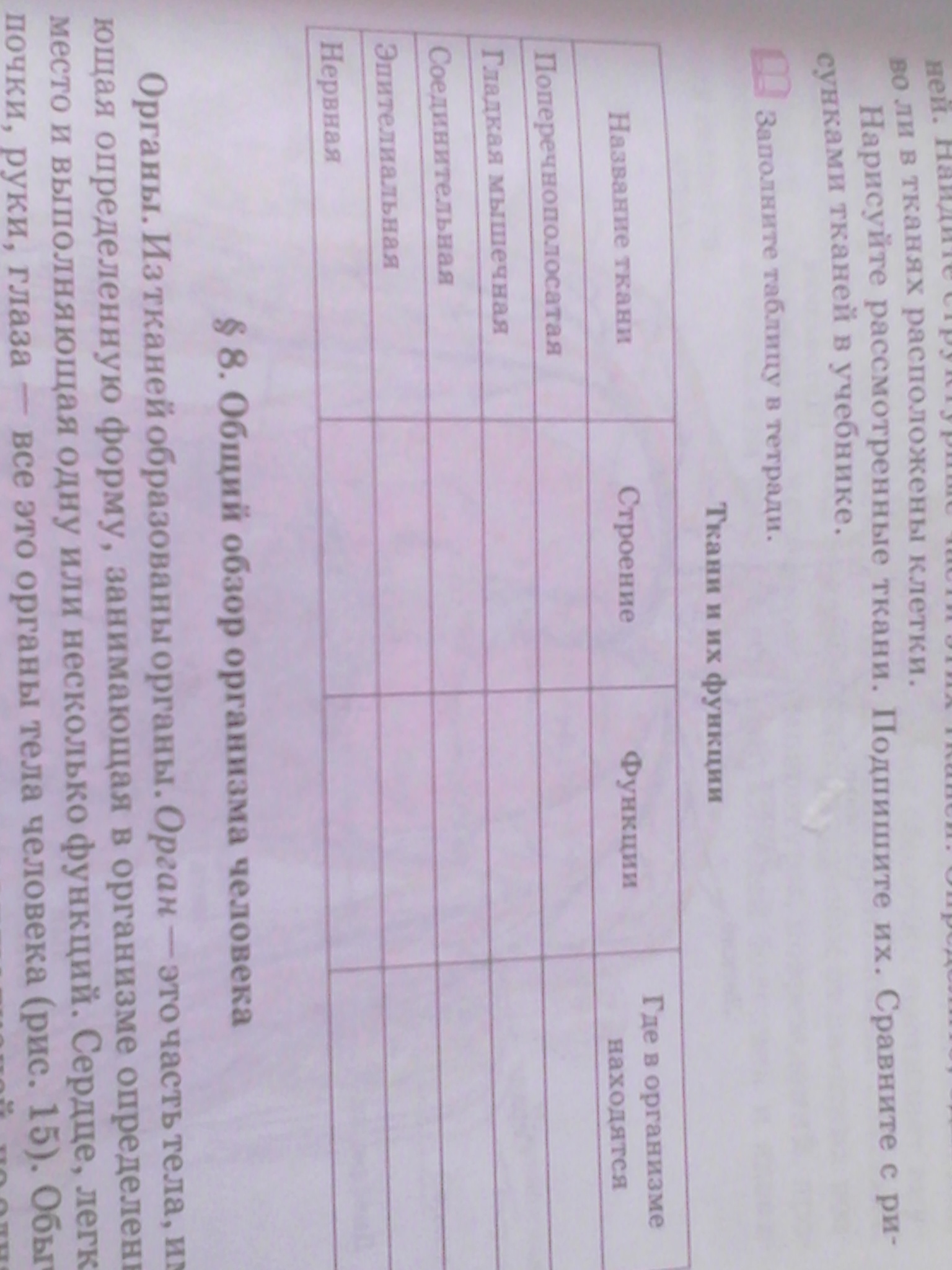 Соединительная: Строение - имеет большое количество межклеточного вещества. Виды ткани: рыхлая волокнистая, хрящевая, костная, кровь. Функции - опора, питание и защита, связь. Находится - кровь, лимфа, хрящи.