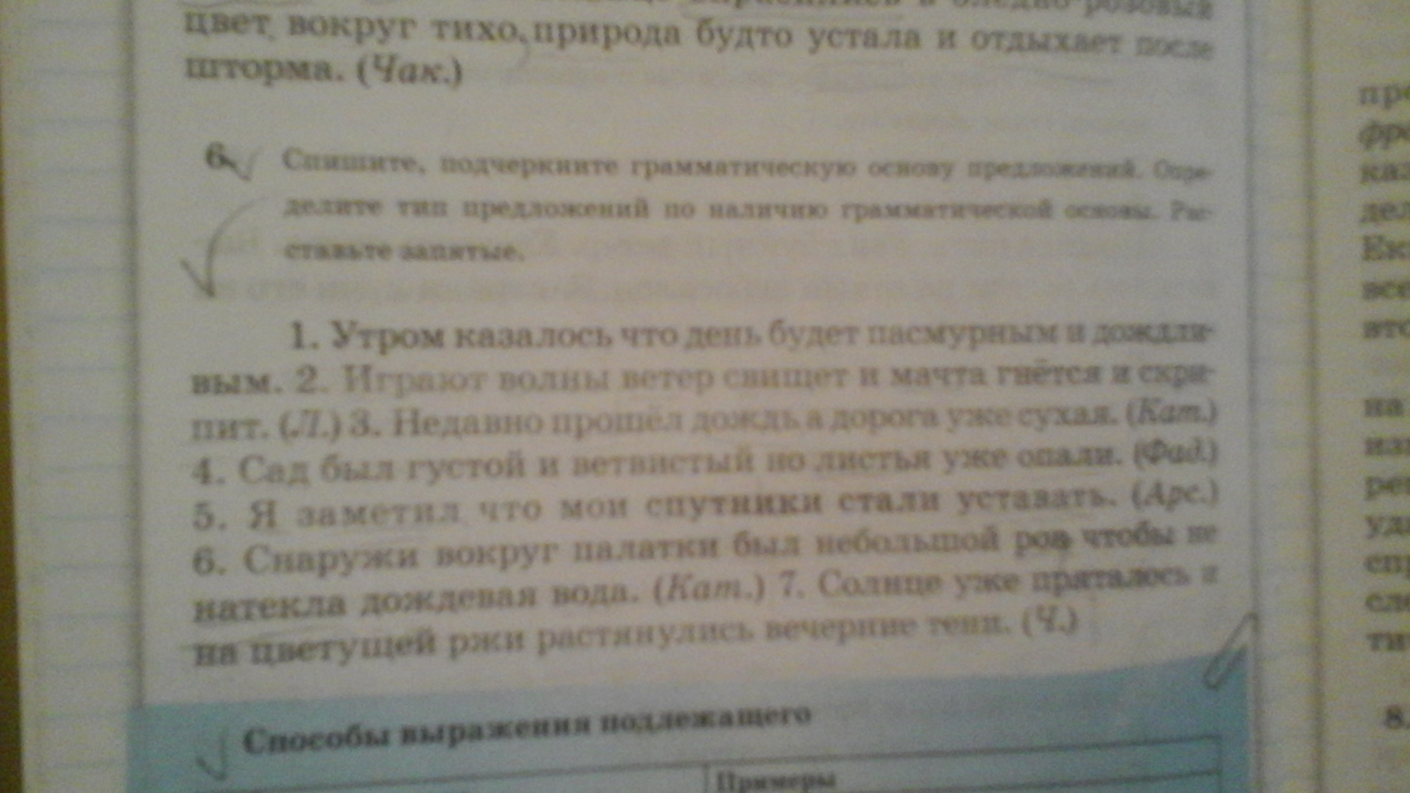 1)День будет.Утром казалось 2)Играют волны,Ветер свищет, мачта гнётся и скрепит 3)Дождь прошёл 4)Сад был, Листья опали. 5) Я заметил, Спутники стали уставать 6)Ров был, Не натекла вода 7)Солнце пряталось, тени растянулись.( Существительные подчеркни 1 полоской,глаголы 2 полосками) 2 граматические основы предложения сложные , 1 граматическая основа предложение простое. Запятые 1) Перед что 2)Перед ветер 3)перед а 4)перед но 6)перед что бы 5)перед что 7) перед растянулись