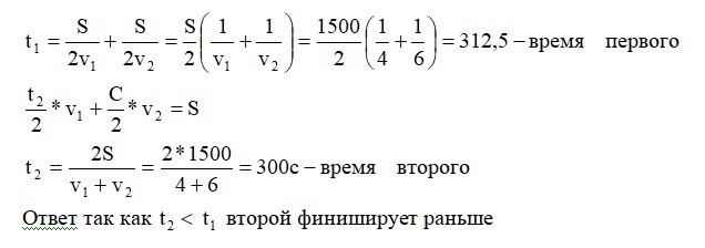На дистанции 1500 м одновременно стартовали бегуны.Первый пробежал половину пути со скоростью 4м.с,другую половину 6м.с.Второй бегун пробежал первую половину времени потраченую на преодоление всей дистанции со скоростью 4м.с,а второй время со скоростью 6 м.с.Кто с бегунов финиширует раньше?