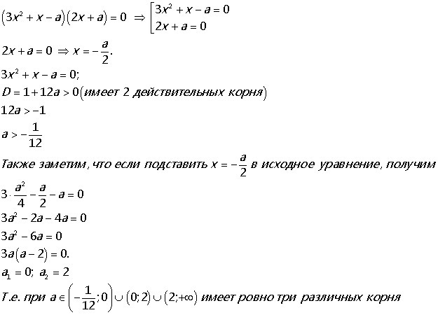 50 баллов, Найдите значения параметра а, при которых многочлен имеет ровно три различных корня: (3x^2+x-a)(2x+a)