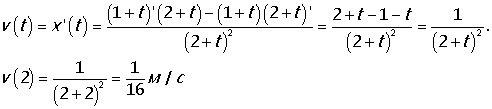 Материальная точка движется по закону x(t)=(1+t)/(2+t). Найти её скорость в момент времени t=2с. Задача на физический смысл производной.