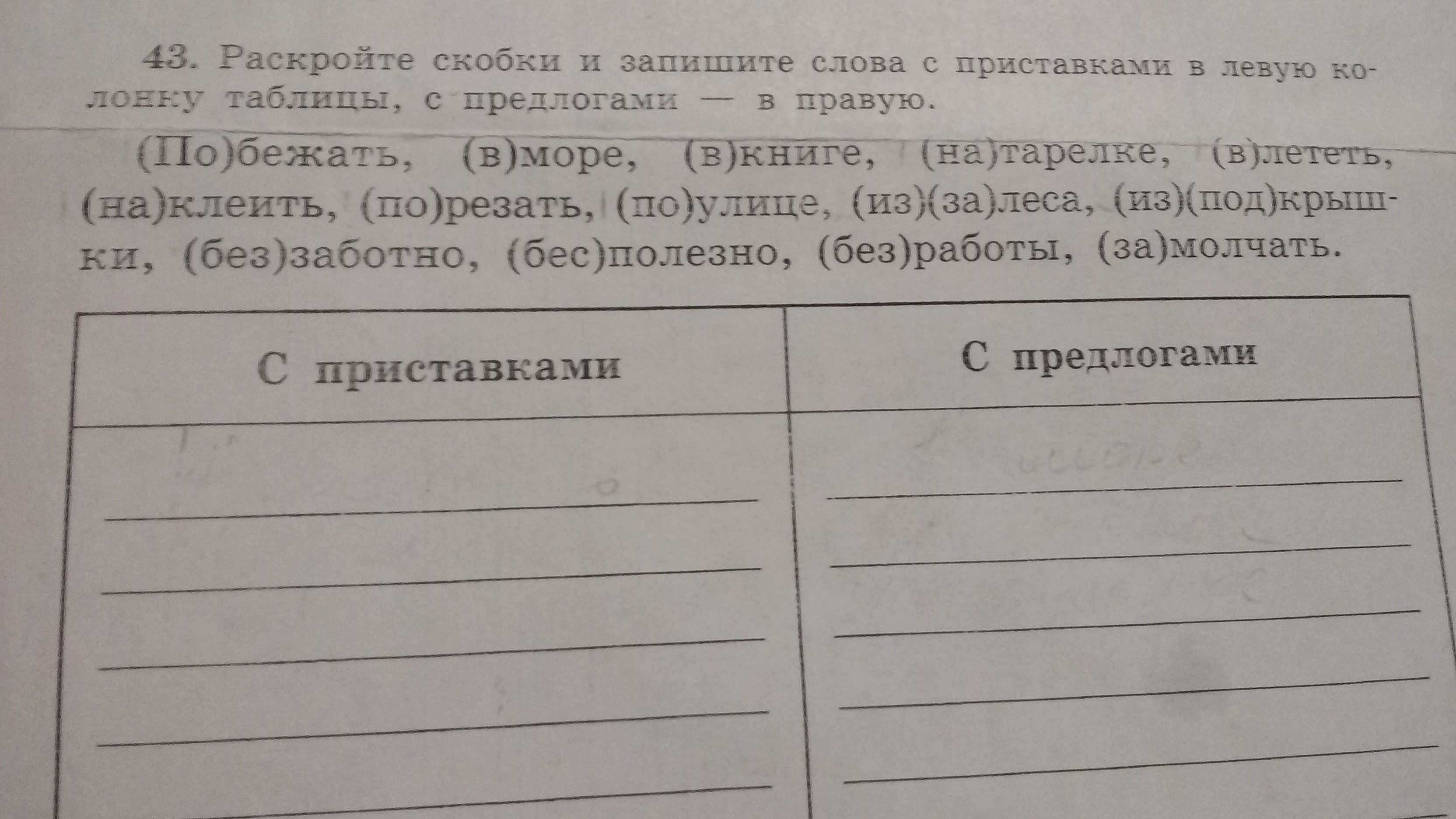 с предлогами: в море, в книге, на тарелке, по улице, из-за леса, из-под крышки, без работы