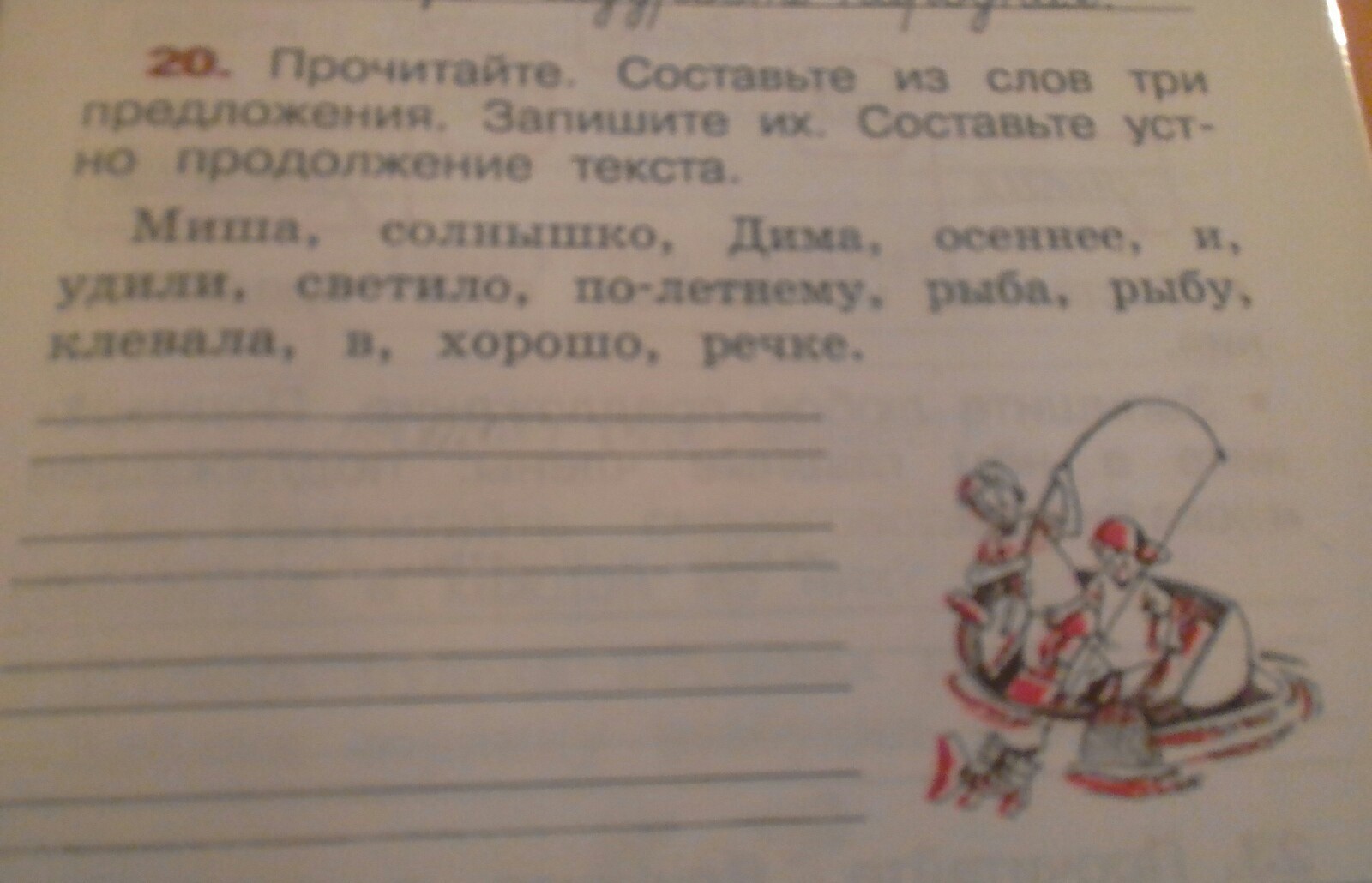 Осеннее солнышко светило по-летнему. Миша и Дима удили рыбу в речке. Рыба клевала хорошо.