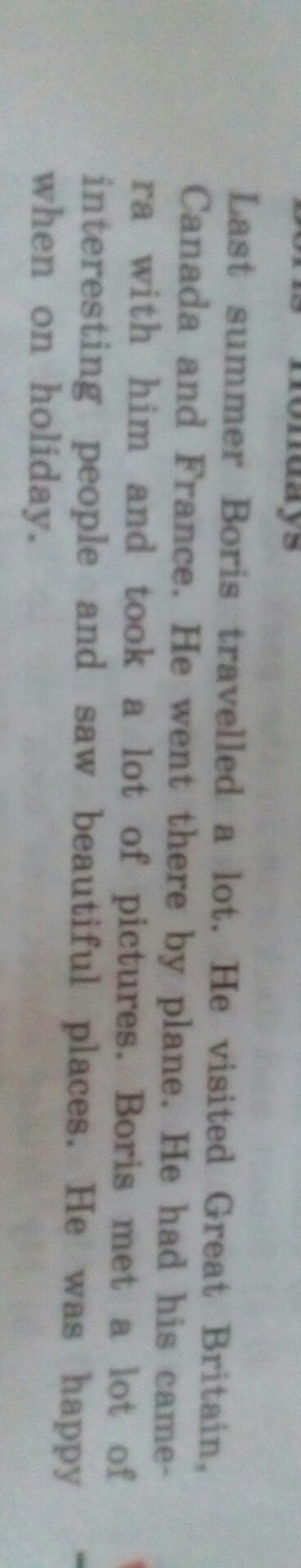 Прошлым летом, Борис много путешествовал. Он побывал в Великобритании, Канаде и Франции. Он отправился туда на самолете. С собой у него была камера, которой он сделал множество фотографий.