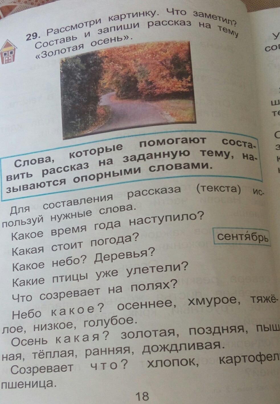 Золотая осень. Пора красоты и вдохновения. Погода ещё тёплая, но уже приближаются зимнии холодные ветра. Все деревья как будто облиты золотой краской. Небо из светлого голубого, превращается в более тёмное. Многие птицы уже улетели, и на их замену прилетают зимнии птицы. Но не стоит растраиваться, ведь после зимы снова придёт весна, и мы опять увидем птиц-лета. Именно в такую осеннюю пору урожай начинает созревать, и получаются совсем вкустные овощи и фрукты. Чаще всего это: картофель, пшеница. Ещё очень много можно сказать об осени, но время летит, да и мне пора.