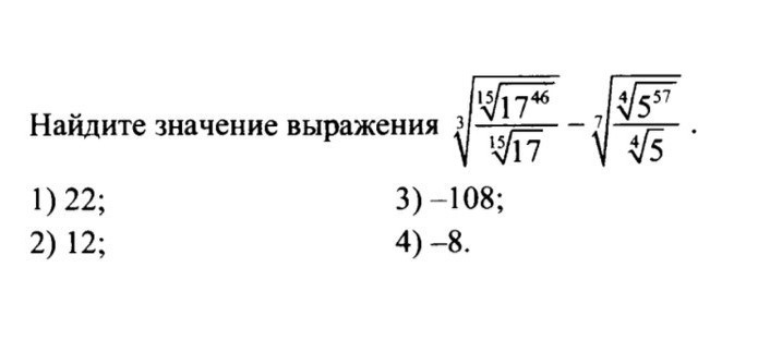 Когда убирает корень делишь степень в которой стоит число на степень корня: типо когда выносить 17 в 45 степени, делишки 45 на 15 получается 17 в 3 затем опять делишки степень 3 на 3 В итоге получится: 17 - 5^2= -8