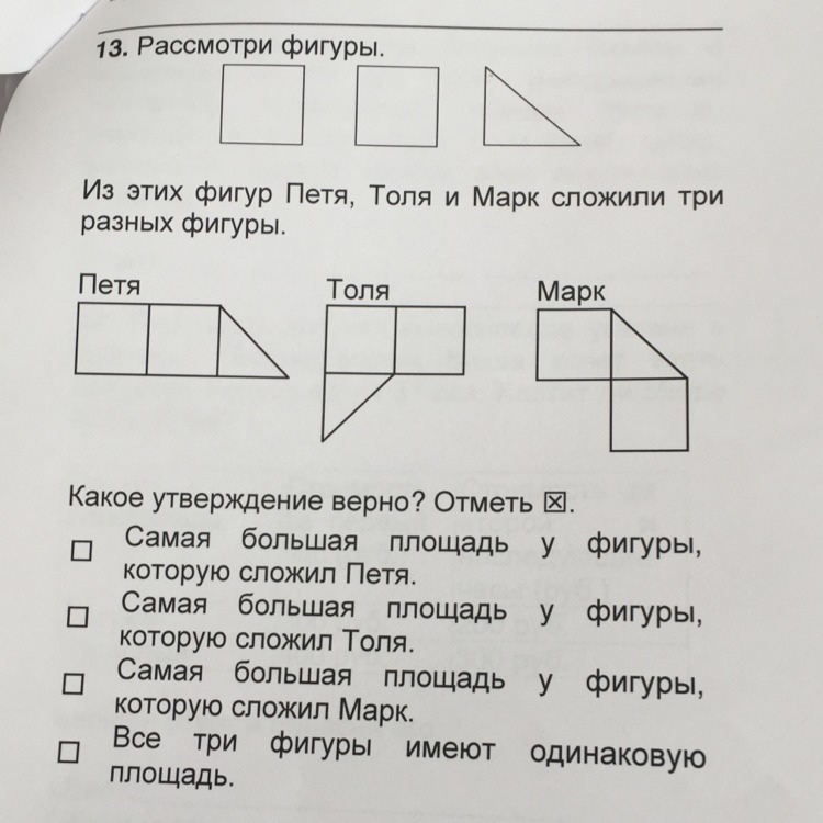 Последнее утверждение верно, т.к. все фигуры состоят из одинаковых деталей (двух квадратов и треугольника)