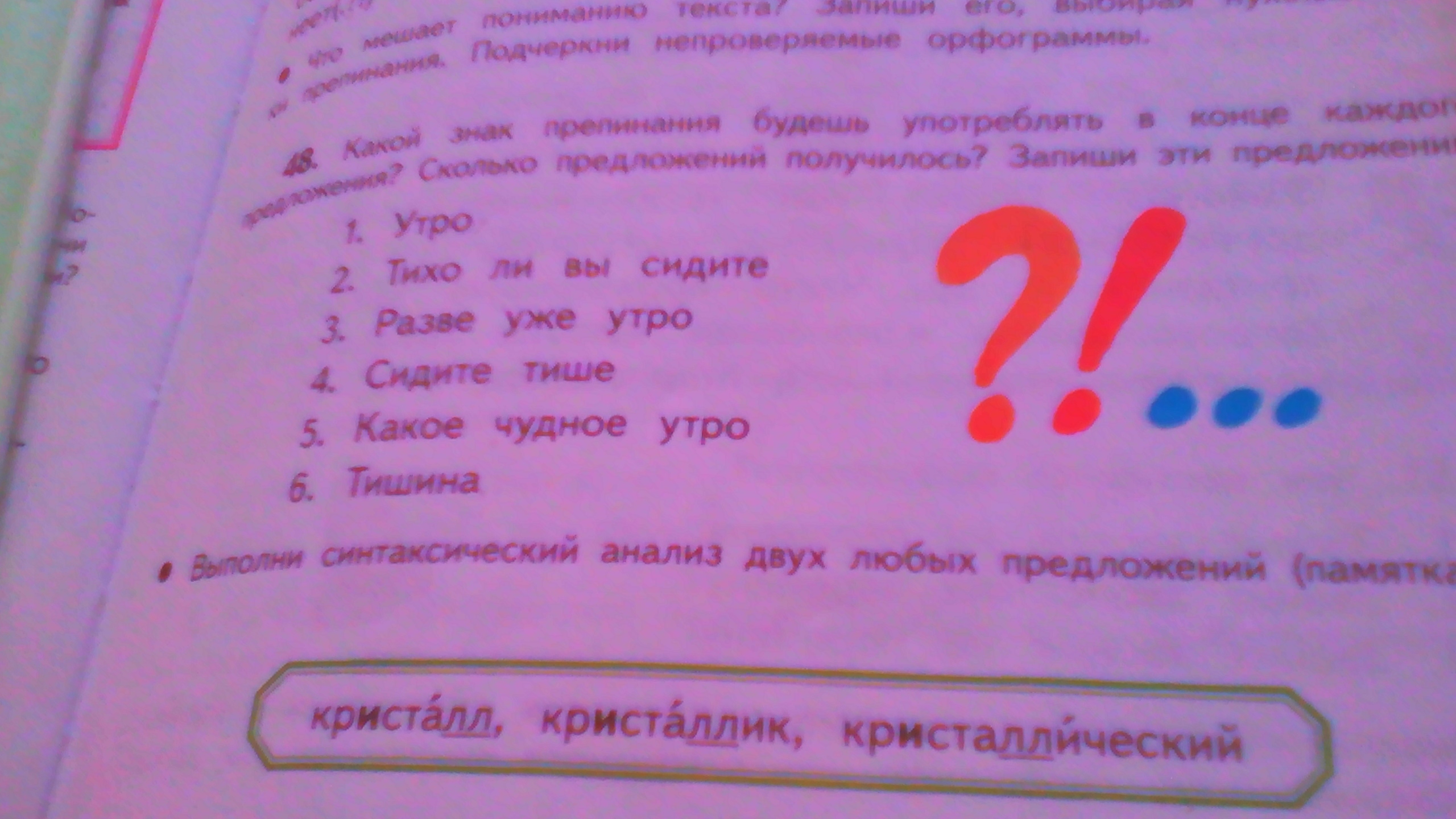 Какой знак препинания будешь употреблять в конце каждого предложения сколько предложений пооучилось запиши эти придложения выполни синтасический анализ двух любых предложений
