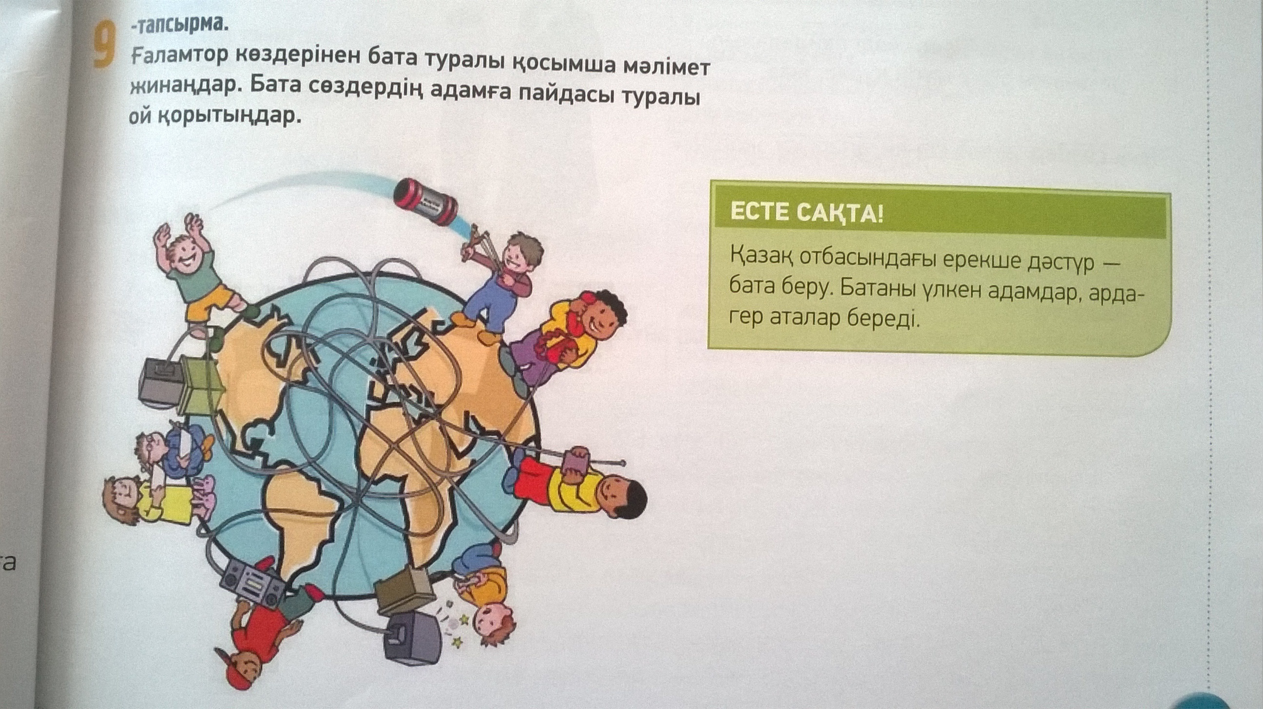 бата беру — адал ниет, жақсы тілек білдірудің ұлттық дәстүрі. Дастарқан басында, түрлі жиын-тойларда, т.б. адам өмірінде кездесер ірілі-ұсақты қуаныштар кезінде той, қуаныш иесіне арнап қол жайып, бата береді. Сондай-ақ, қиын сапар, алыс жолға аттанған азаматына ақ жол тілейтін халқымыздың ежелден келе жатқан, кең таралған дәстүрлерінің бірі. Бата беретіндер, көбіне, көпті көрген ақсақалдар мен кемеңгер де дуалы ауызды билер болып келеді. Бата қысылғанда — қуат, қиналғанда—медет беріп, әрбір іс-әрекетіңе даңғыл жол ашып, бәле-жаладан қорғайды деп есептелген. Бата көзі тірілерге ғана емес, аруақтарға да жасалған. Батасыз, тілексіз өмір болмайды. “Батамен ер көгереді, жаңбырмен жер көгереді” деп халқымыз текке айтпаған. Батаның да қисыны, айтылатын, айтылмайтын жері болады, қуаныш пен тойдың ретіне қарай, соған лайық Бата тілегі болады.
