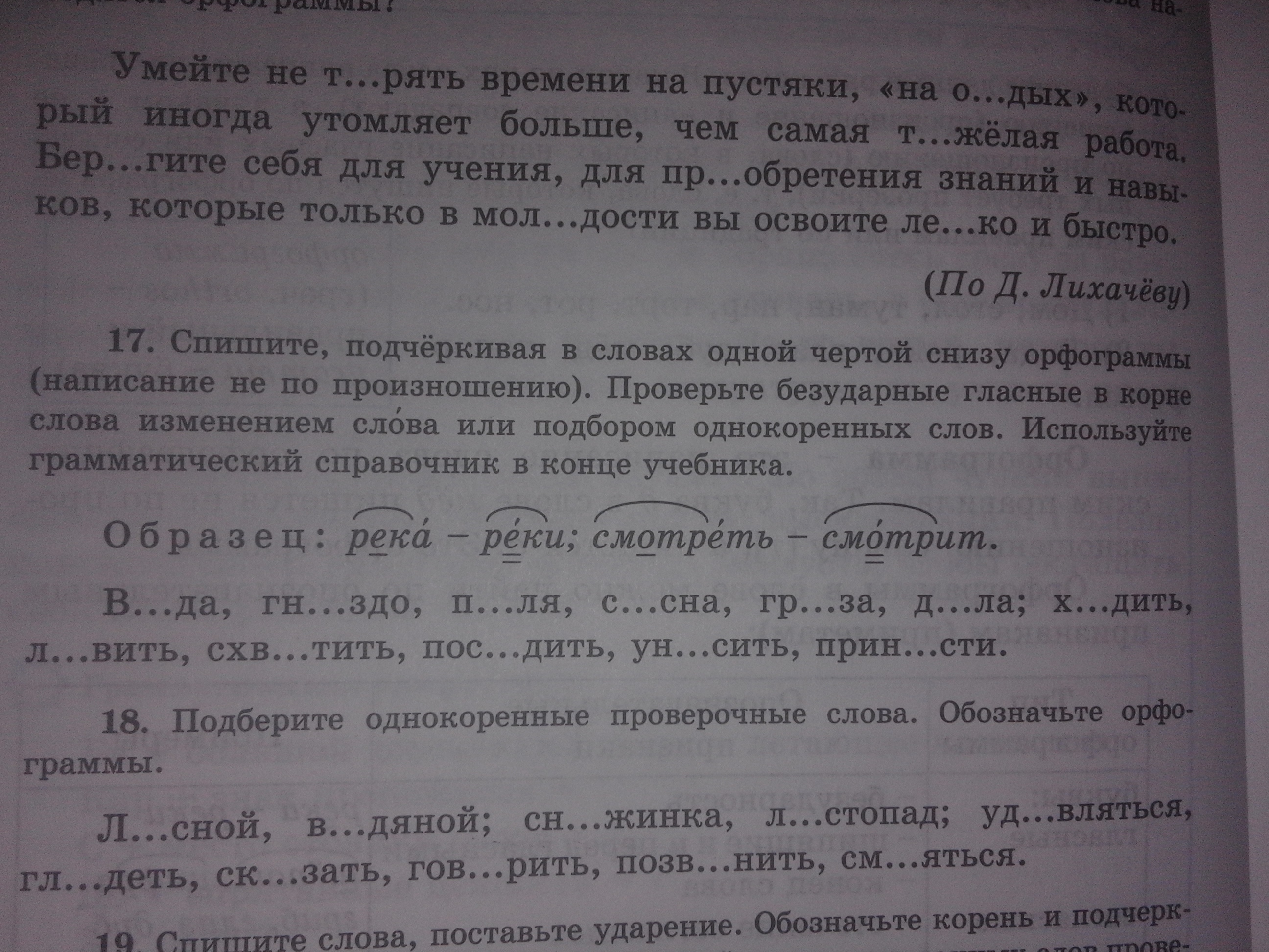 Вода - вОды; гнездо - гнЁзда; поля - пОле; сосна - сОсны; гроза - грОзы; дела - дЕло;ходить - хОдит; ловить - лОвит; схватить - схвАтит; посадить - посАдит; уносить - унОсит; принести - принЁс.