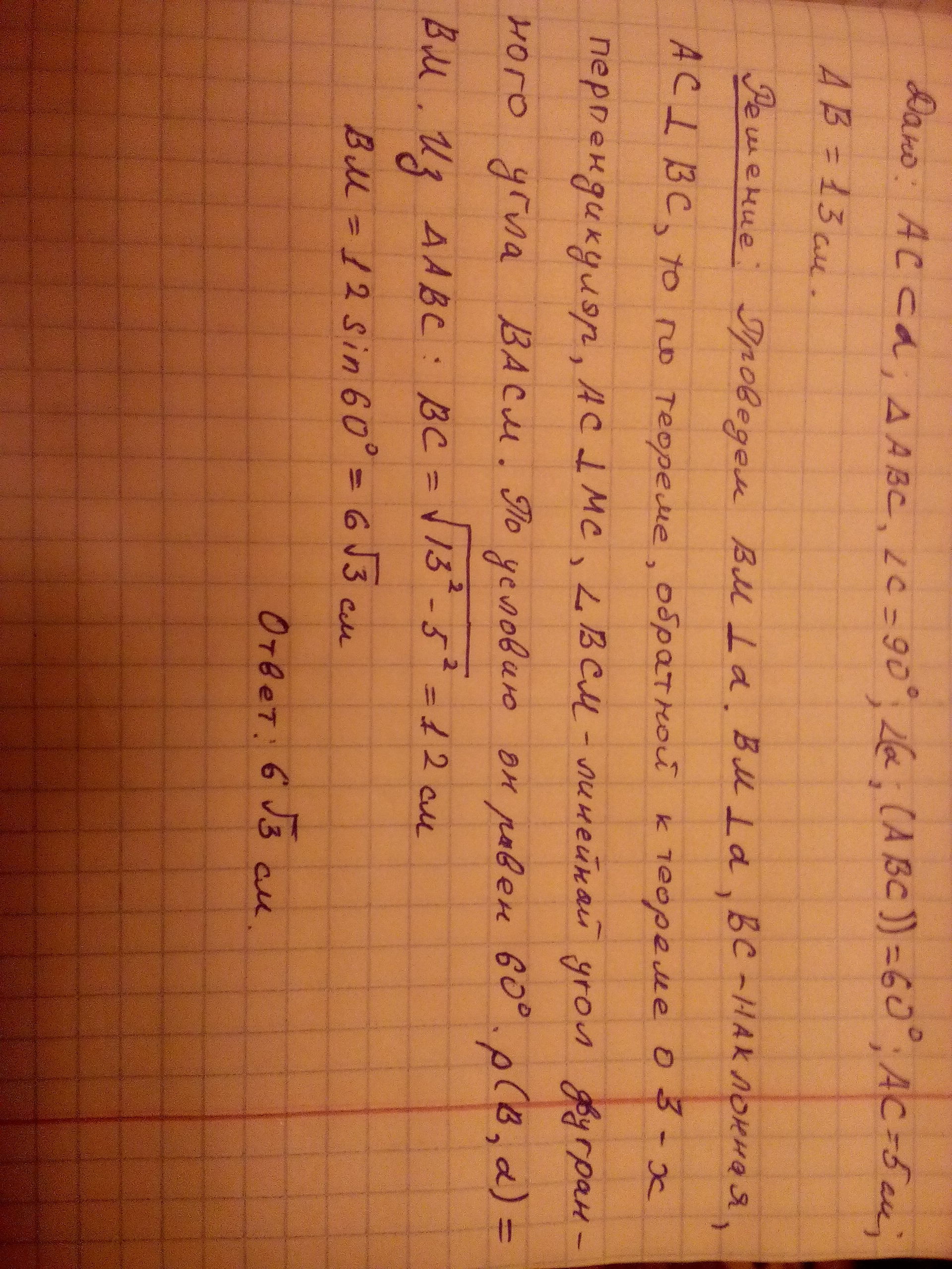 Катет АС прямоугольного треугольника АВС с прямым углом С ледит в плоскости а, а угол между плоскостями а и АВС равен 60°. Найдите расстояние от точки В до плоскости а, если АС=5 см, АВ=13см.