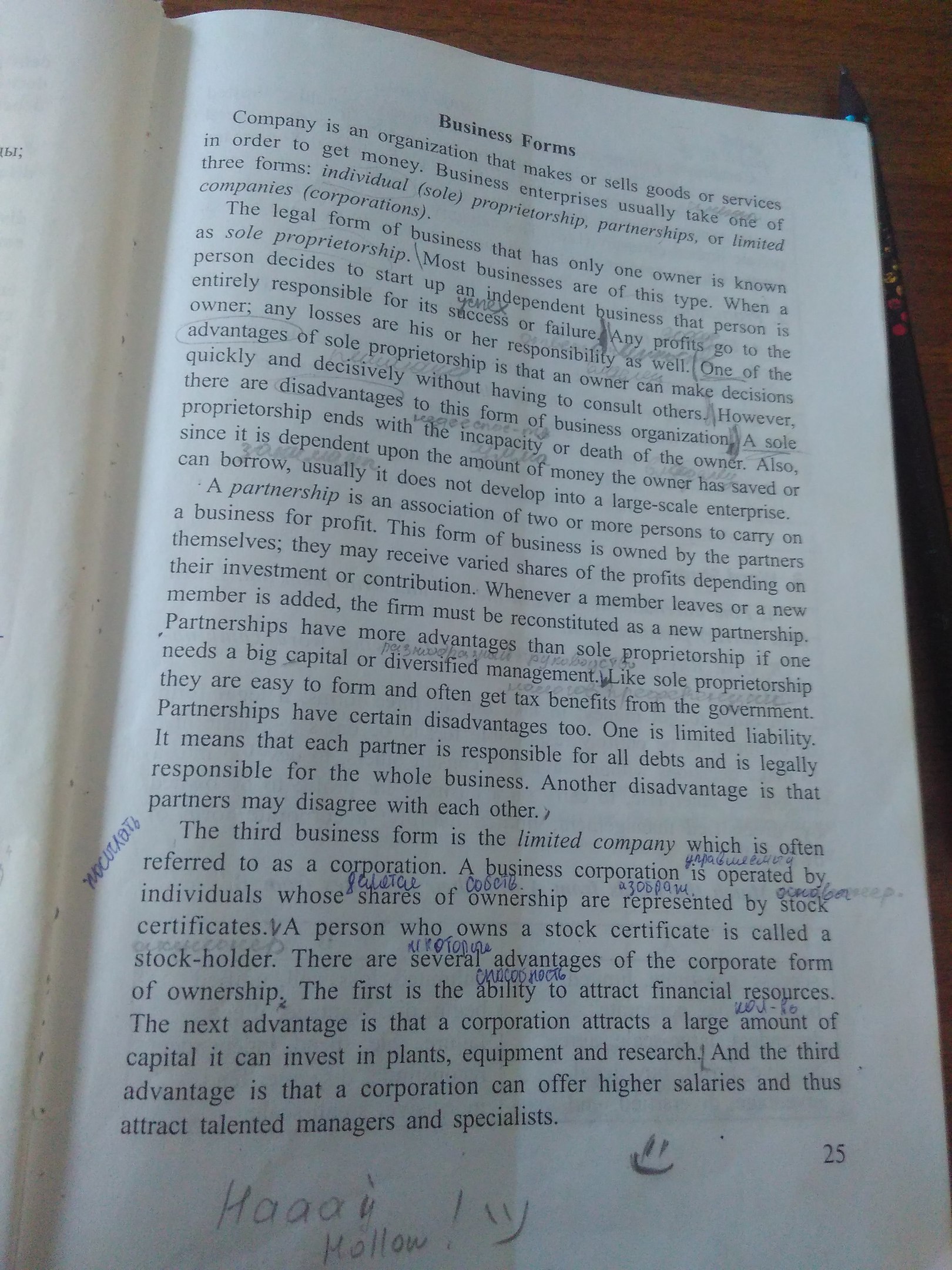 Третий вид - это общество с ограниченной ответственностью, которое часто называют корпорацией. Корпорация управляется людьми, чьи акции на собственность представлены сертификатами акций. Человек. который владеет сертификатом акций, называется акционер. Есть несколько преимуществ корпорации. Первая - это способность привлекать денежные ресурсы..