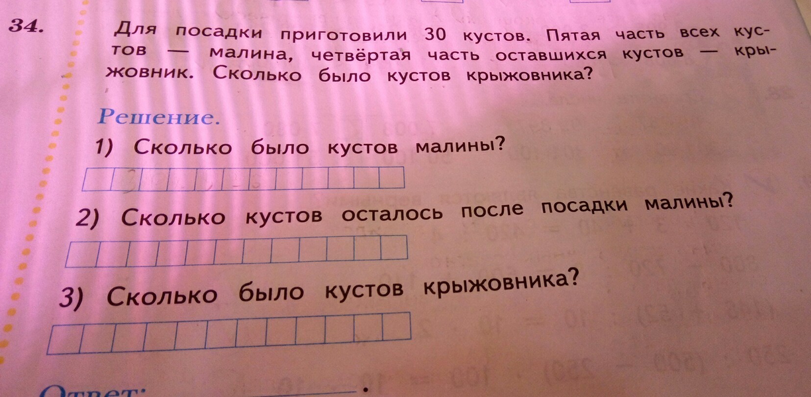 для посадки приготовили 30 кустов пятая часть всех кустов малины 4 часть оставшихся кустов крыжовника Сколько было было крыжовника 50 балов
