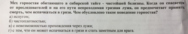 Это обусловлено тем,что горностай испачкается и всё равно погибнет,ибо станет заметным для своего врага)