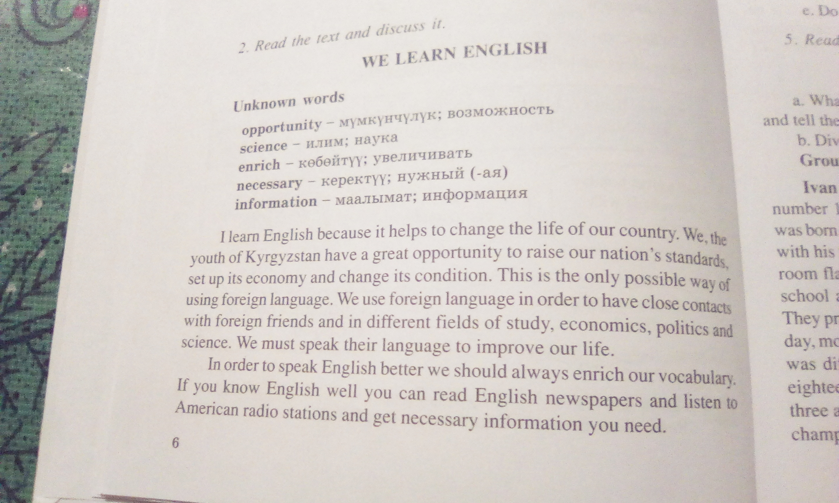 Я читаю английский, потому что он помогает изменить жизнь нашей страны, мы, молодёжь Кыргызстана, имеем прекрасную возможность поднять уровень нашей экономики в своей экономике и изменить её состояние. Это единственный возможный способ использования иностранного языка. Мы используем иностранный язык, чтобы иметь близкую связь с иностранными друзьями и в разных областях обучения, экономики,политики и науки. Мы должны говорить на их языке, чтобы улучшить нашу жизнь.