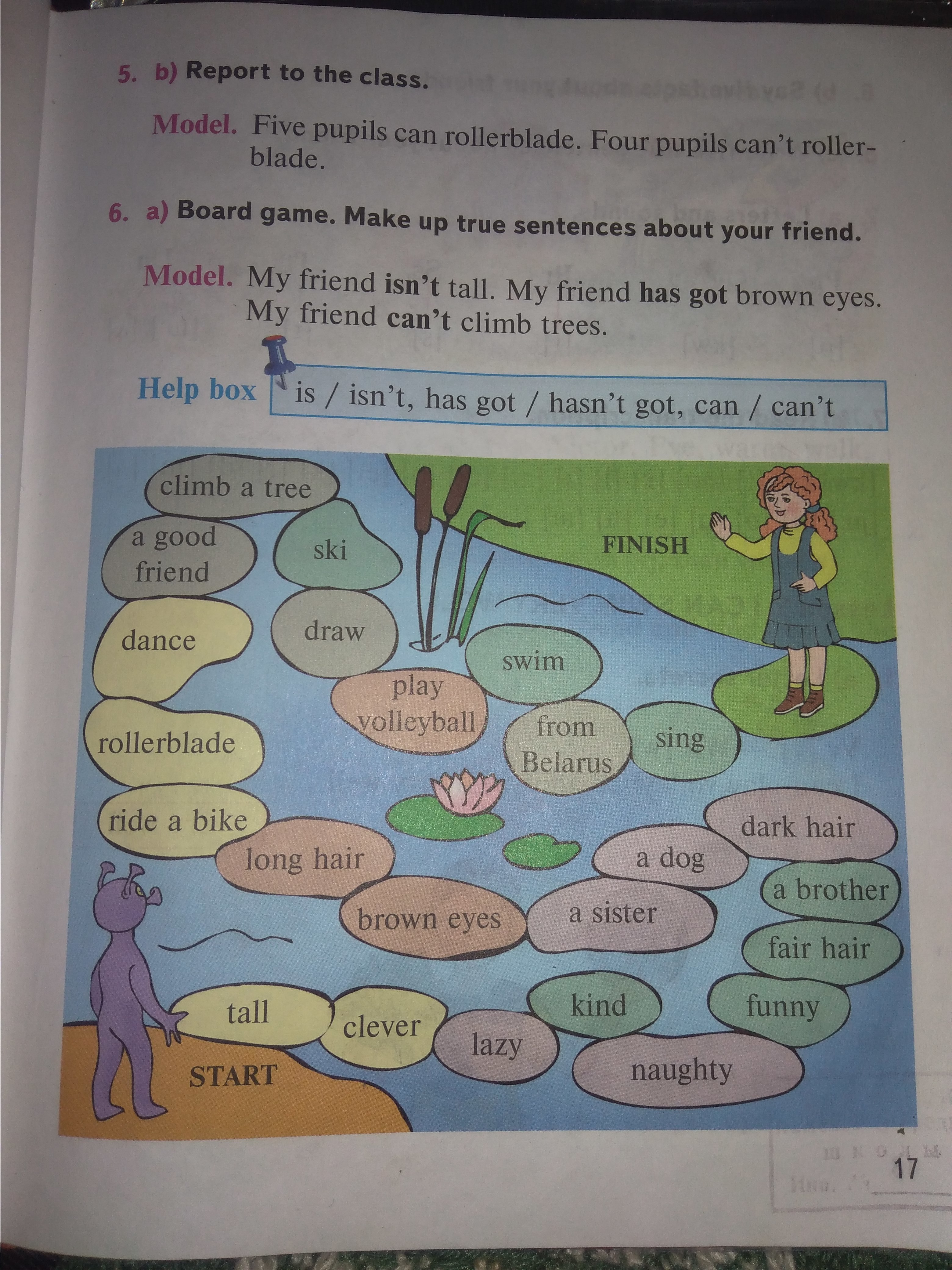my friend is funny. my friend has a dog. my friend can't swim.