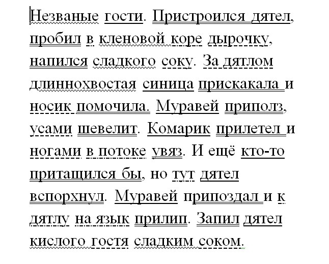 Незваные гости. Пристроился дятел, пробил в кленовой коре дырочку, напился сладкого соку. За дятлом длиннохвостая синица прискакала и носик помочила. Муравей приполз, усами шевелит. Комарик прилетел и ногами в потоке увяз. И ещё кто-то притащился бы, но тут дятел вспорхнул. Муравей припоздал и к дятлу на язык прилип. Запил дятел кислого гостя сладким соком. подчеркните все члены предложения.
