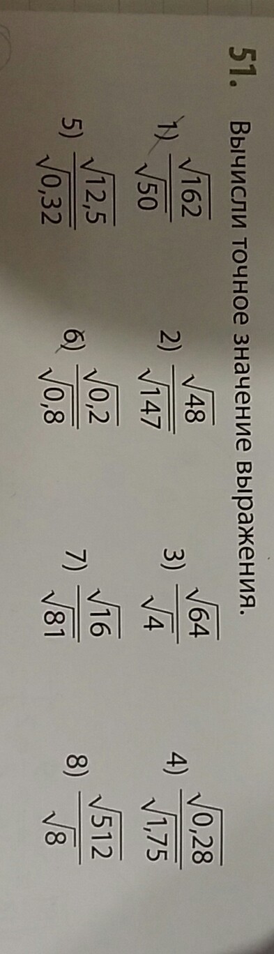 \6) frac{ sqrt{0,2} }{ sqrt{0,8} }=frac{1}{4}=0,5;