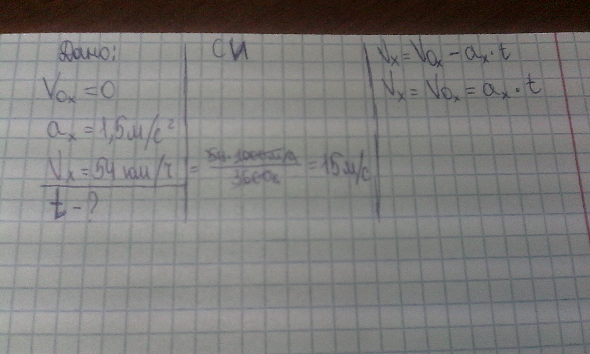 V0x=0 ах=1,5 м/с² Vx=54 км/ч Найти: t