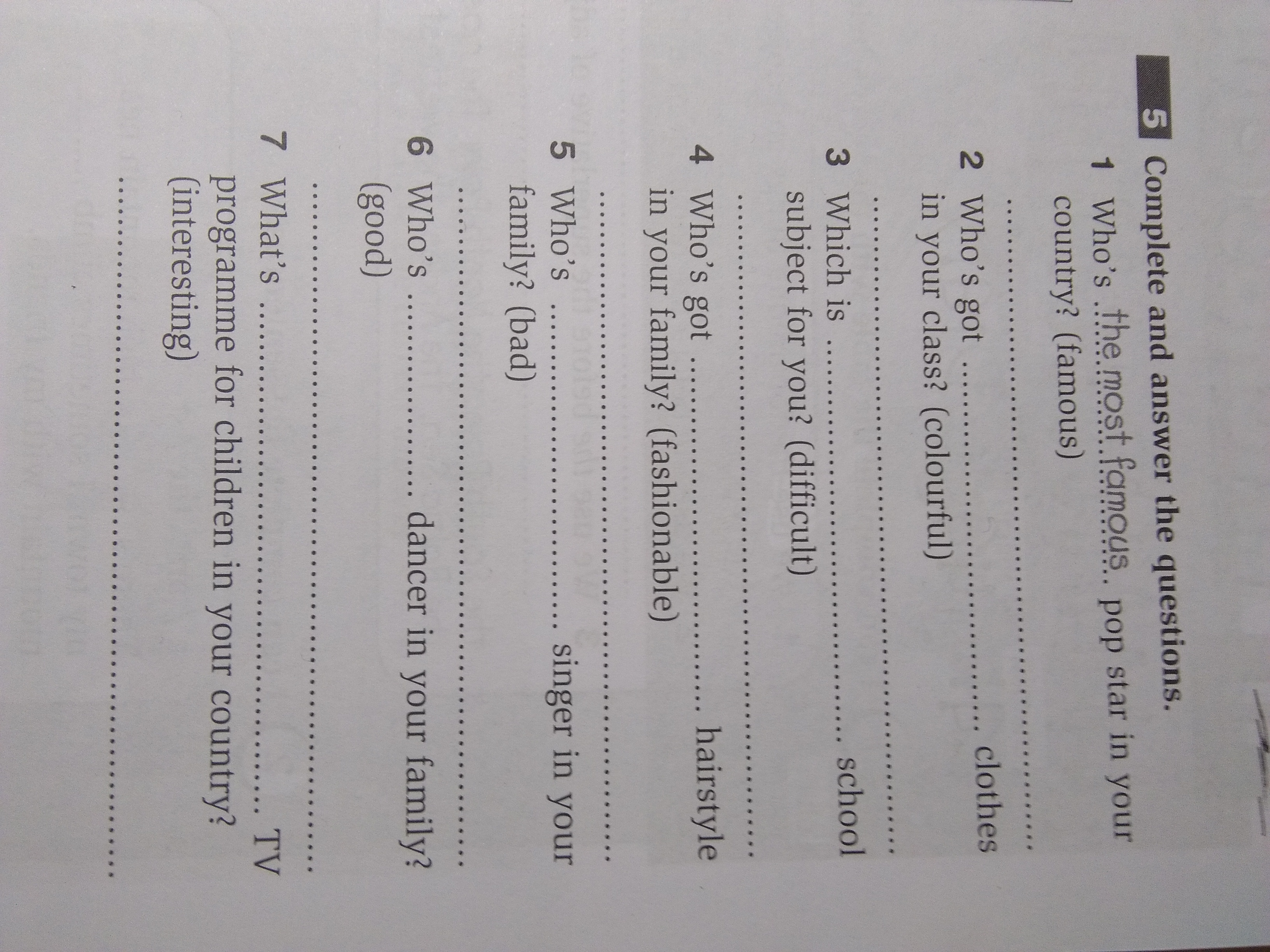 1) ответ: Alla Pugacheva is the most famous pop star in Russia.2) Who's got the most colorful clothes in your class?