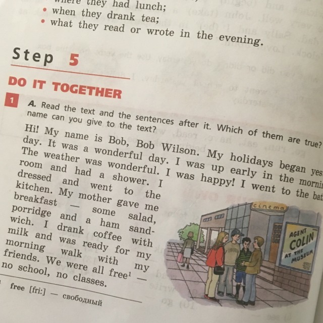 Привет! Меня зовут Боб, Боб Вилсон. Мои каникулы начались вчера. Это был чудесный день. Я встал рано утром. Погода была прекрасной. Я был счастлив! Я пошел в ванную комнату и принял душ. Я оделся и пошел на кухню. Моя мама приготовила мне завтрак - немного салата, каша и бутер с ветчиной. Я выпил кофеек с молоком и был готов для утренней прогулки с моими друзьями. Мы были абсолютно свободны: ни школы, ни уроков.