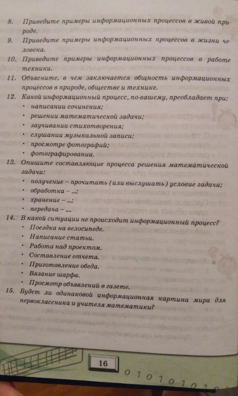 Информационный процесс происходит,т.к. живой организм даже не может жить без него,не то,что уж выполнять какие-то действия... 15 Нет,потому что,первоклассник в отличии от учителя математики не достаточно взрослый для того,чтобы понять до конца смысл информации