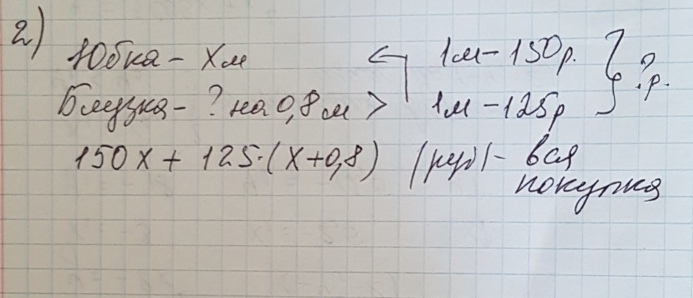 Мама купила на юбку x м ткани, а на блузку на 0.8м больше. Сколько стоит вся покупка, если цена ткани на блузку 125р за 1 м, а на юбку 150р. за 1 м? ( УРАВНЕНИЕМ)