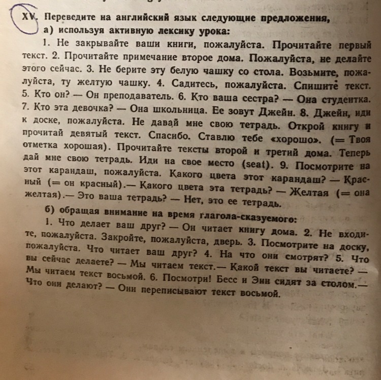 1. Do not close your books, please. Read the first text. 2. Read the second house note. Please do not do this now. 3. Do not take this white cup from the table. Take, please, that yellow cup. 4. Sit down, please. Spisshnme text. 5. Who is he? he is a teacher. 6. Who is your sister? She is a student 7. Who is this girl? she's called Jane. 8. Jane, go schoolgirl. to the blackboard, please. Do not give me your notebook. Open the book and read the ninth text. Thank you. I'm giving you "good." Your mark is good). Read the texts of the second and third houses. Now give me your notebook. Go to your seat. 9. Look at this pencil, please. What color is this pencil? What color is this notebook? Is it yellow? Is this your notebook? -No, this is her notebook. b) 1. What does your friend do? He reads a book at home. 2. Do not enter those, please. Please close it. 3. Look at the board, please. Door. What is your friend reading? 4. What do they look at? 5. What are you doing now? -We read the text. What text are you reading? we read the text of the eighth 6. Look! Bess Ann is sitting at the table. "What are they doing?" -They're rewriting text eight.