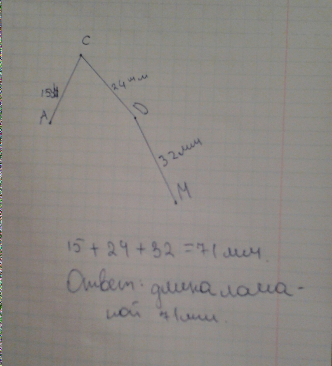 просто на линейке отмерь 15 мм, 24 мм и 32 мм и нарисуй ломаную, а потом сложи эти числа